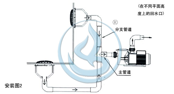 如果是面積較小的桑拿池,水療池等,可以在池底裝一個,在池壁裝一個(如圖2)。注意不可同時堵住兩個防吸排水口。